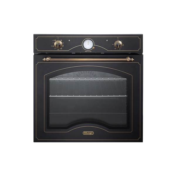 Altre descrizioni strutturali | Forno elettrico multifunzione Classe energetica A (9F) Manopole e maniglia finitura ottone anticato Programmatore di inizio e fine cottura analogico Funzione Easy Steam e Idroclean Funzione Booster – preriscaldamento rapido Funzione termoventilata 3D Cavità 74 litri con telai laterali a 7 livelli di posizionamento Ventilazione tangenziale di raffreddamento 1 luce alogena Accensione automatica della luce con l’apertura della porta Porta con vetro interno facilmente estraibile Accessori: leccarda, 2 griglie piane |