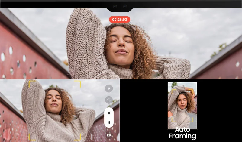 La doppia fotocamera frontale (Ultra-grandangolare e Principale) garantisce registrazioni in 4K. L'inquadratura automatica mantiene sempre i riflettori puntati sul protagonista.